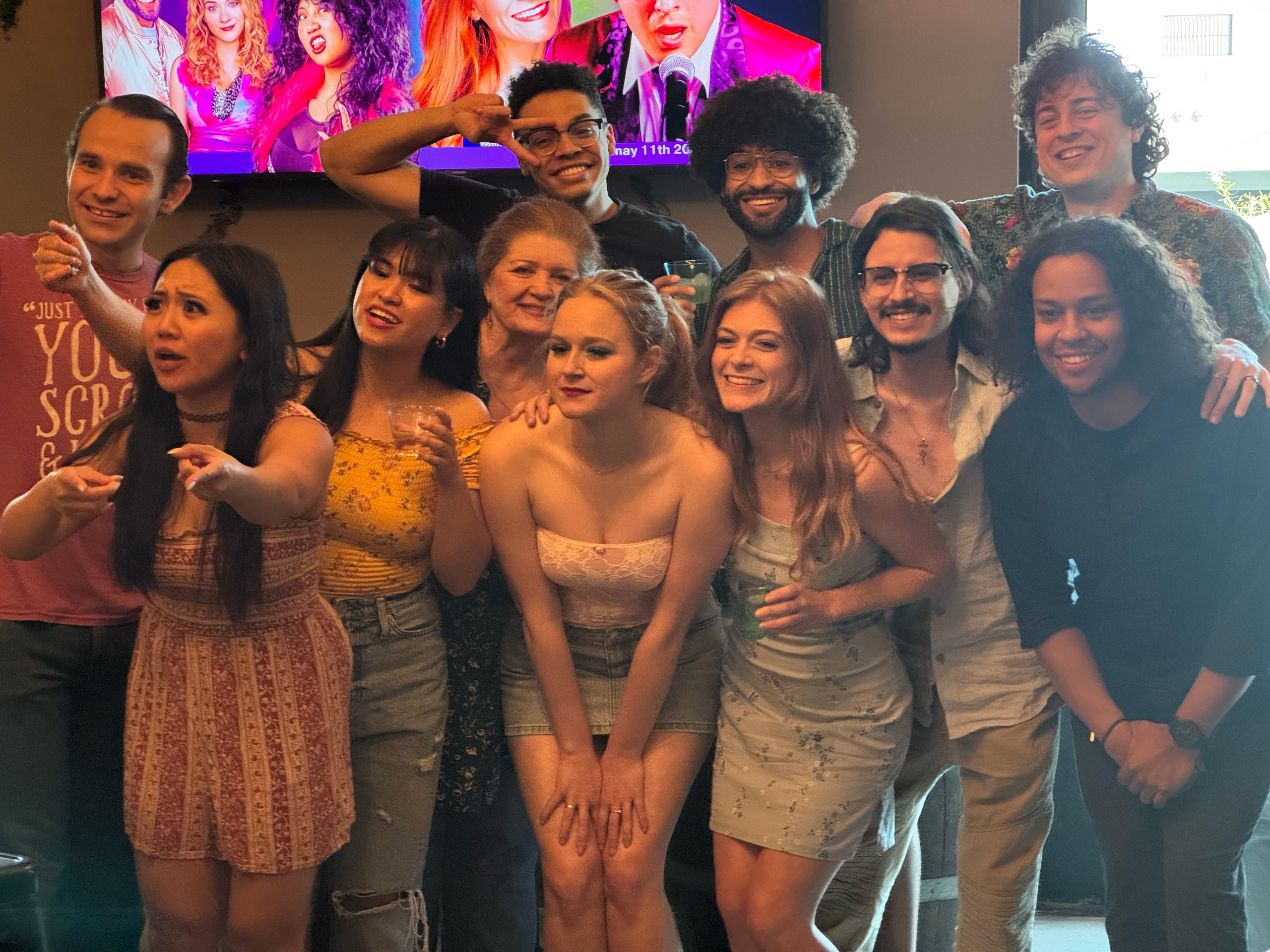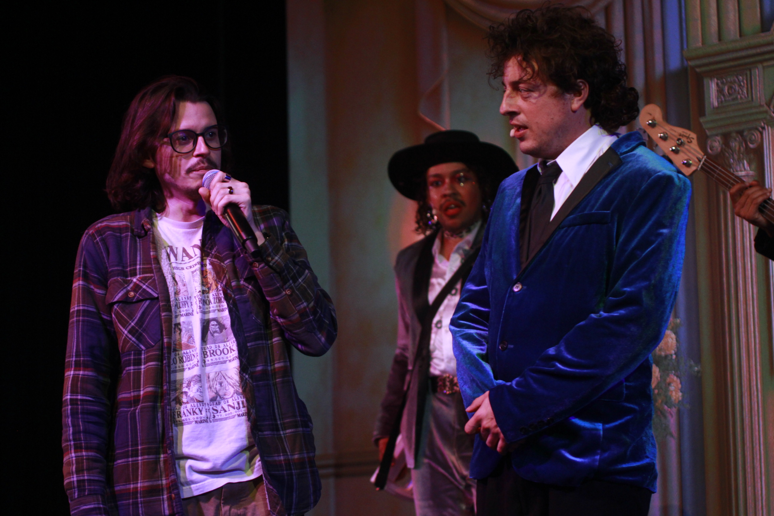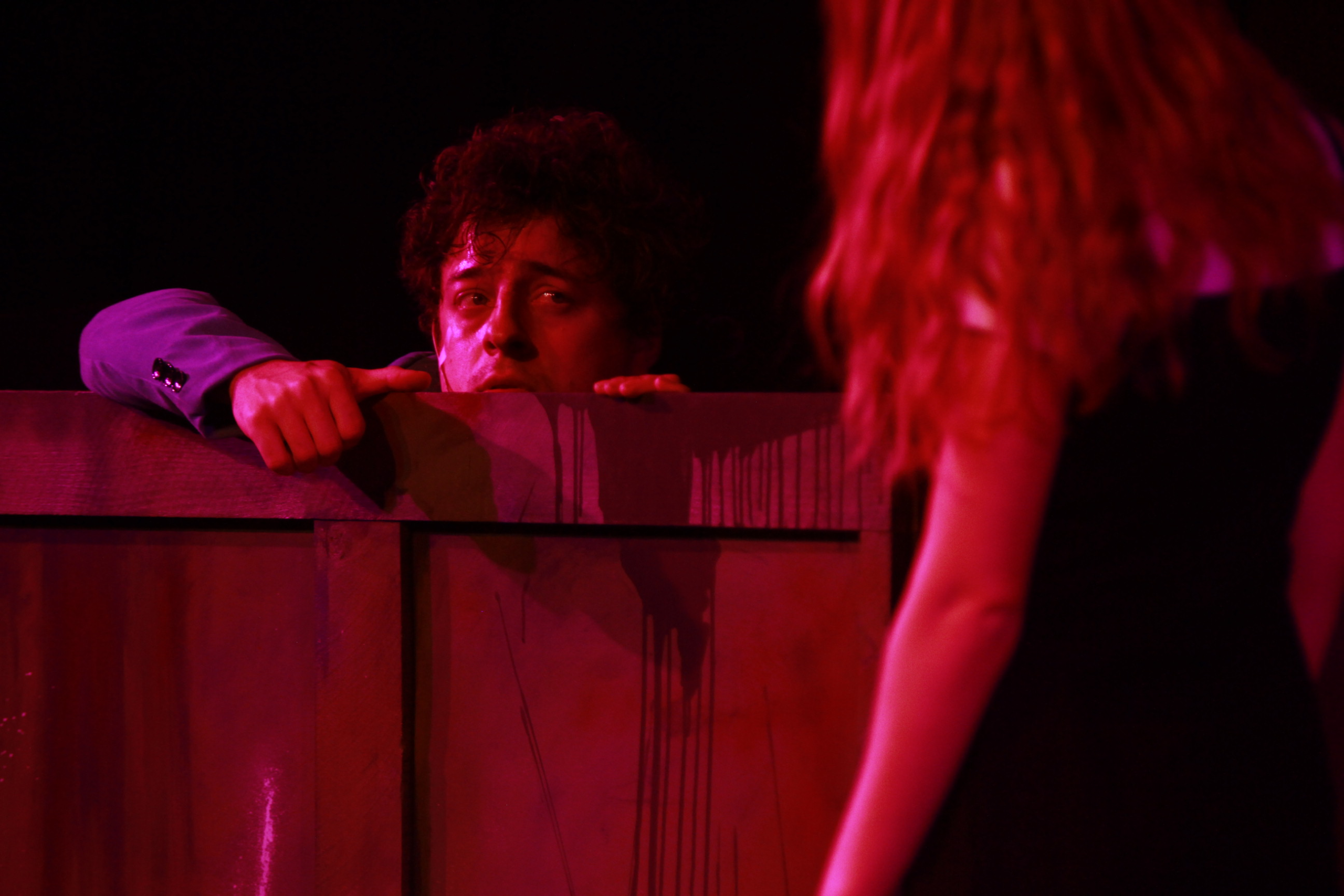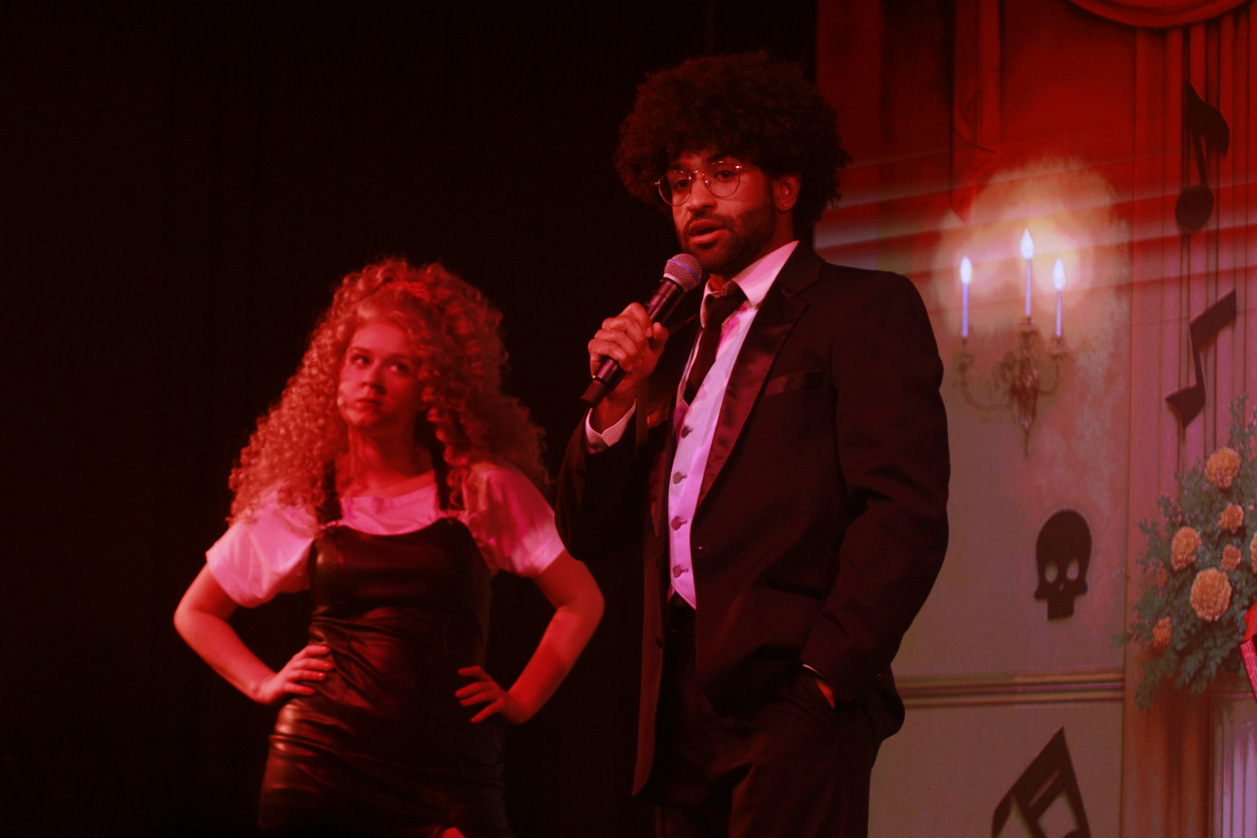 Our staging was cinematic, cold, and viciously specific. The finale wasn’t a romantic romp through Vegas — it was a corporate sacrifice. Julia’s wedding unfolded beneath a massive portrait of Ronald Reagan — the smiling mascot of the “Greed Is Good” machine that devours everyone in the story.