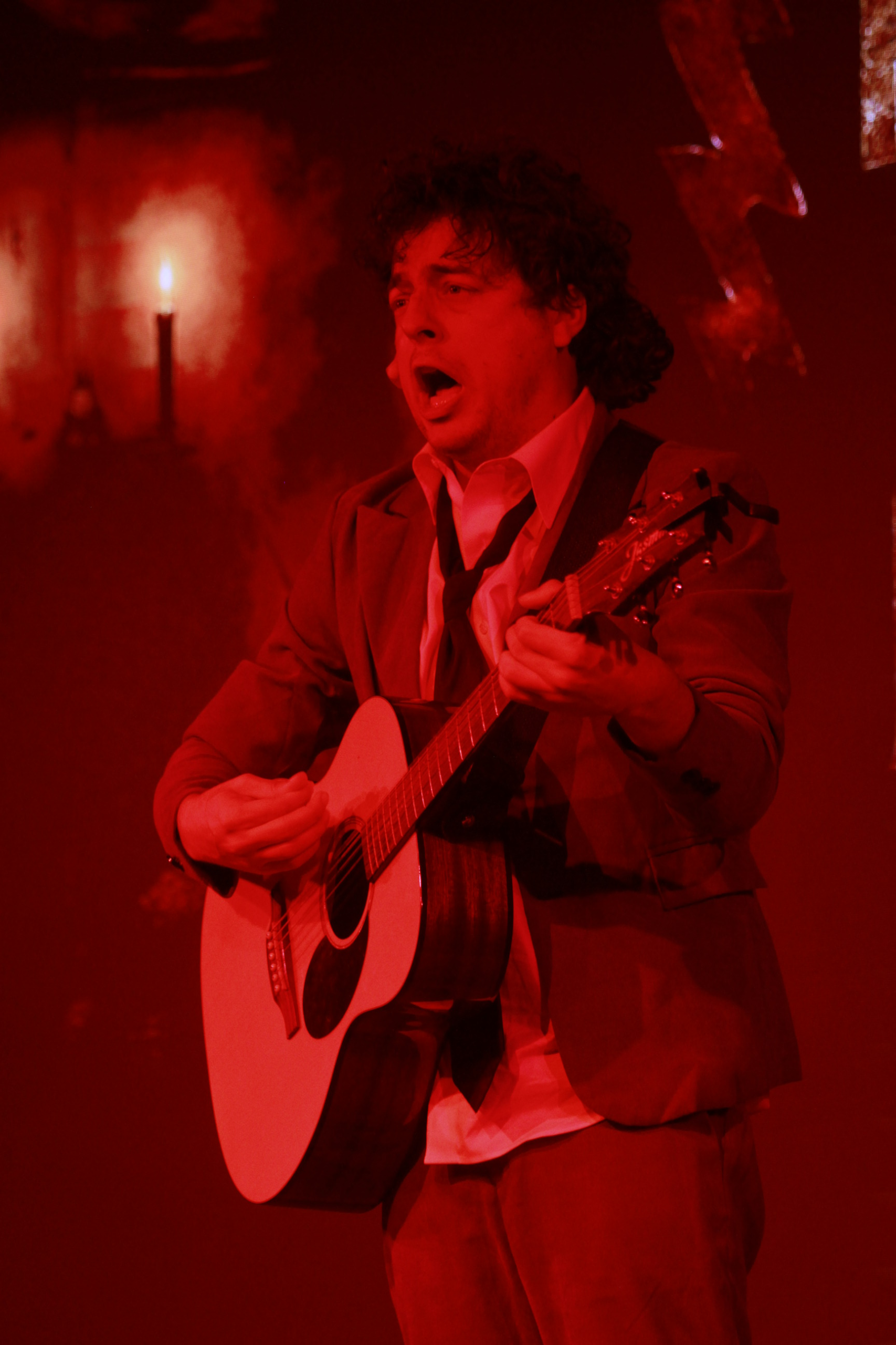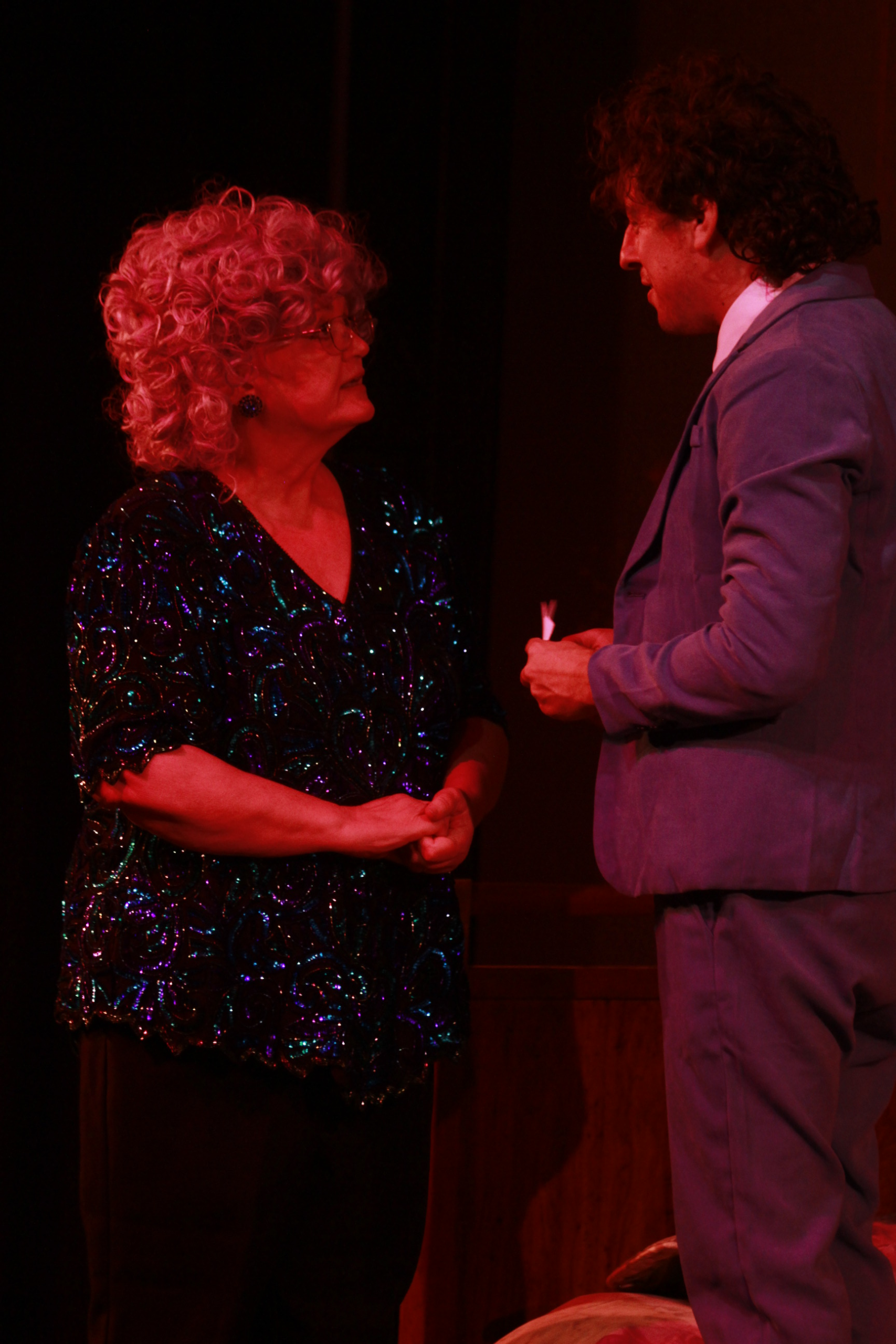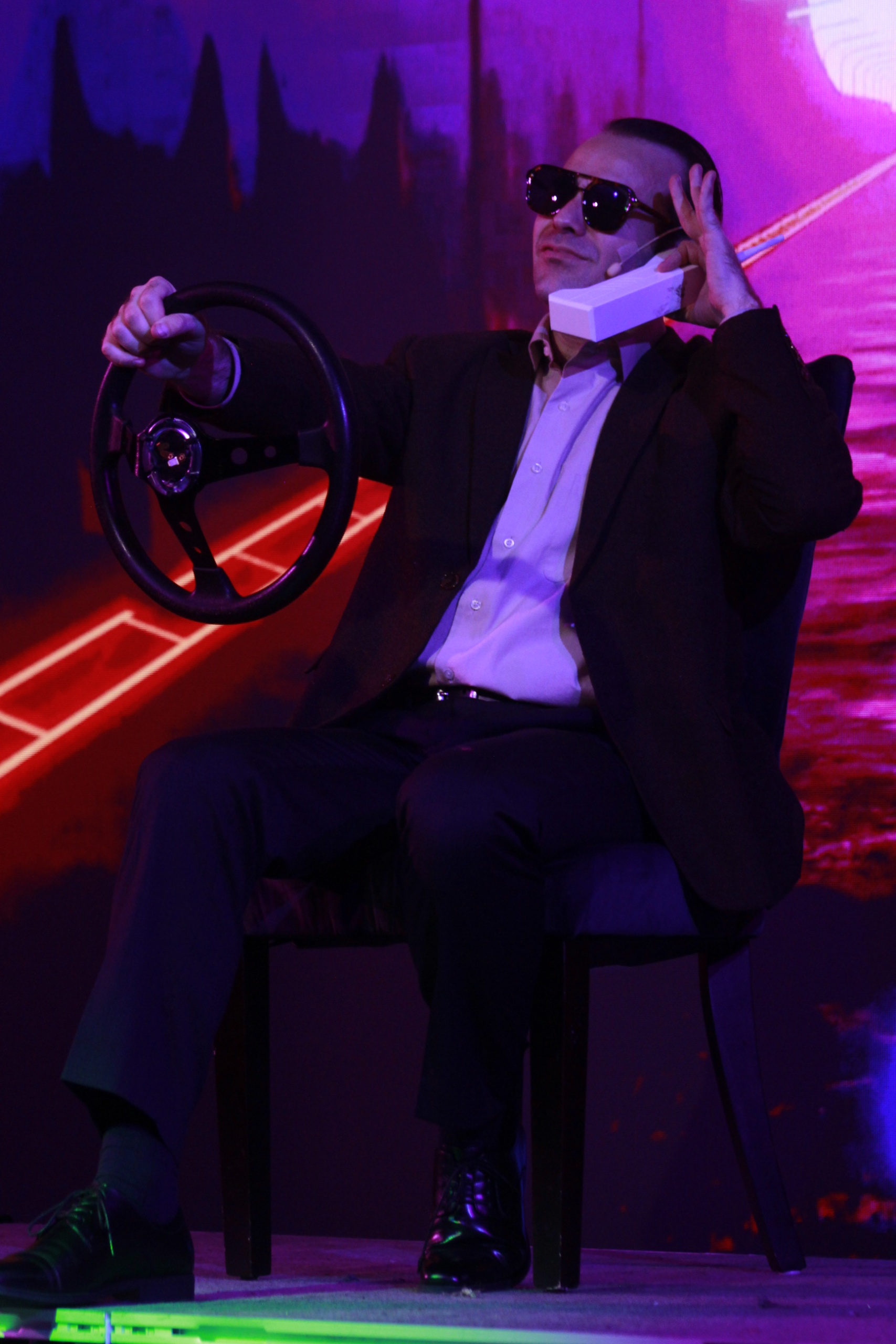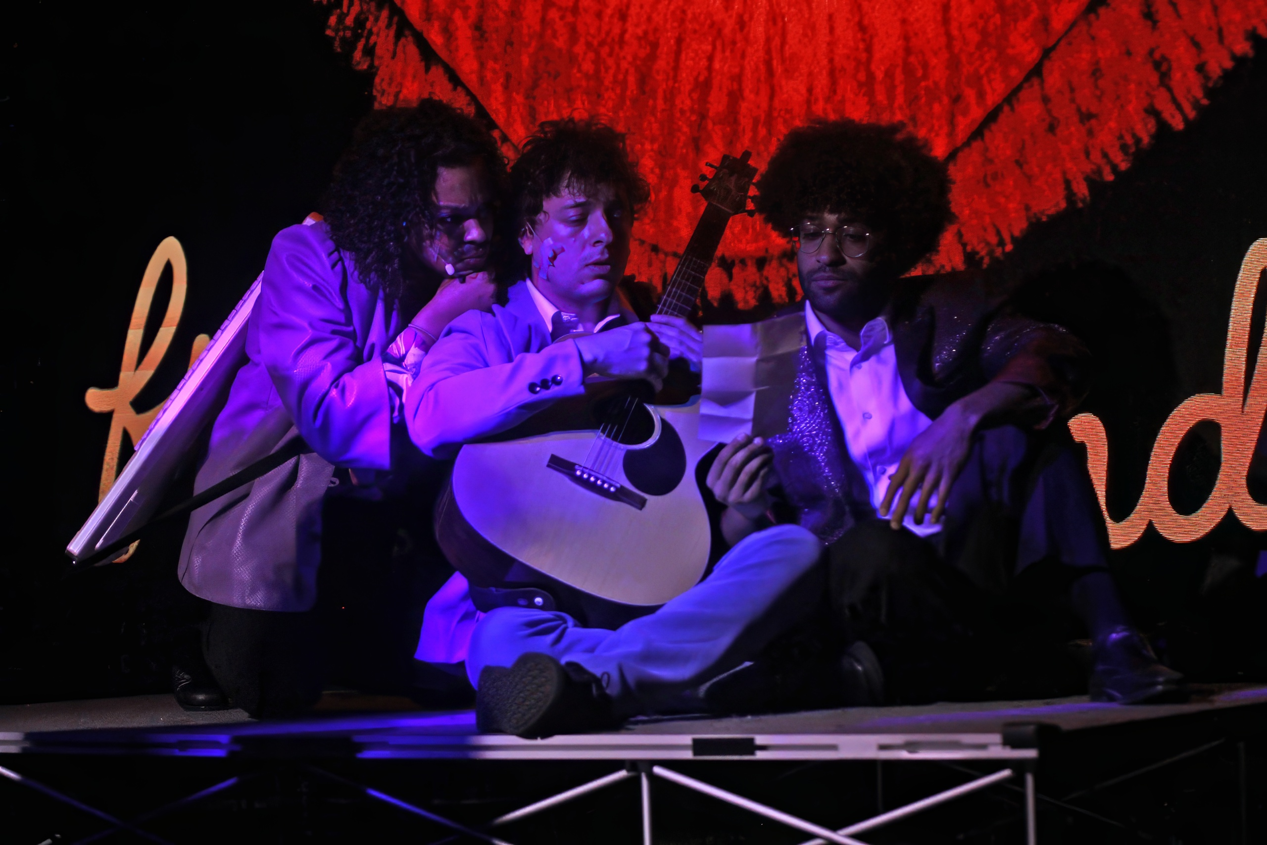 Our staging was cinematic, cold, and viciously specific. The finale wasn’t a romantic romp through Vegas — it was a corporate sacrifice. Julia’s wedding unfolded beneath a massive portrait of Ronald Reagan — the smiling mascot of the “Greed Is Good” machine that devours everyone in the story.